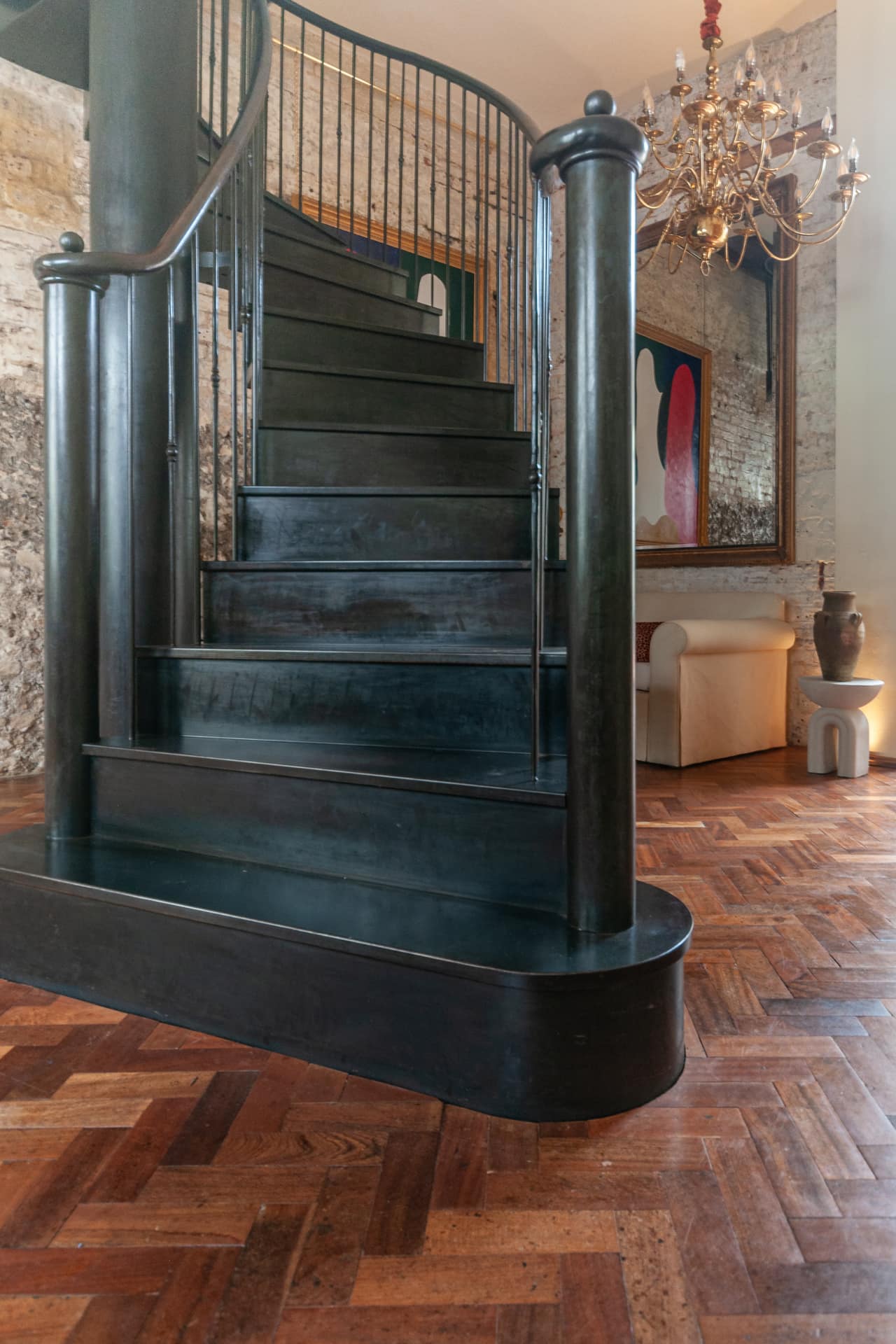 A bespoke steel staircase creates a striking focal point that zones the room into a dining /working space and relaxing space.